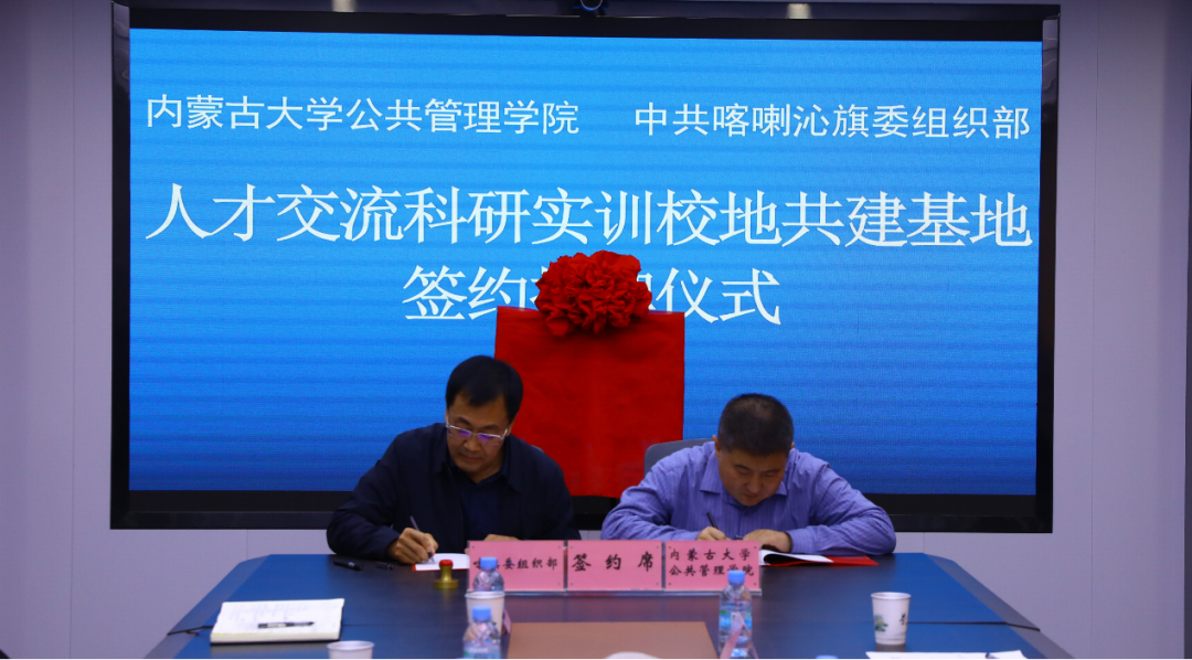 2138cn太阳集团城副院长安华教授与喀喇沁旗委组织部部长张永桥共同签署《人才交流科研实训校地共建基地合作协议》,并为人才交流科研实训校地共建基地揭牌。